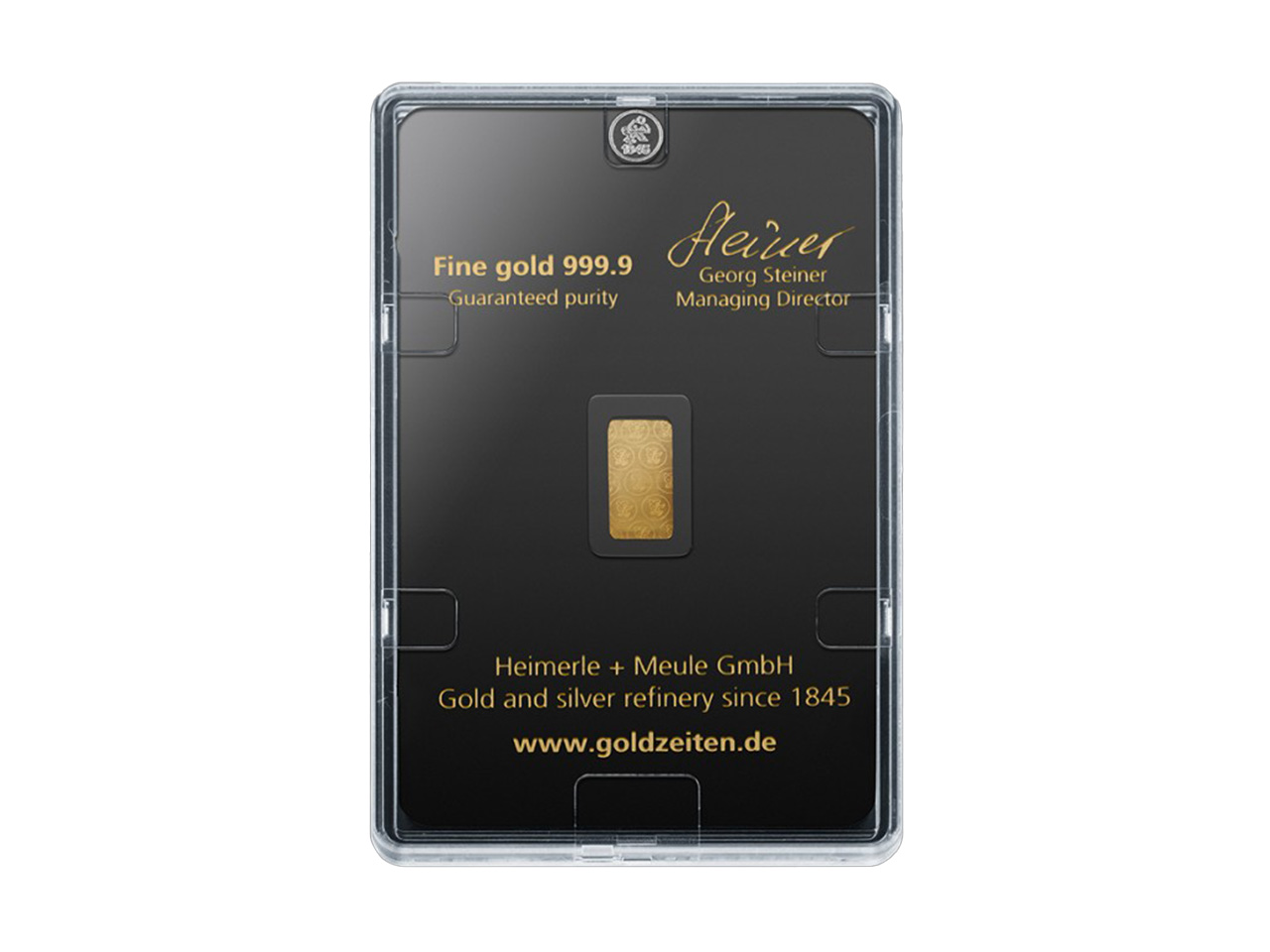 Lingot d’or fin 2.5 g en or pur 99,99 %, certifié LBMA, fabriqué par Heimerle und Meule. Numéroté, avec certificat. Investissement sûr et reconnu.